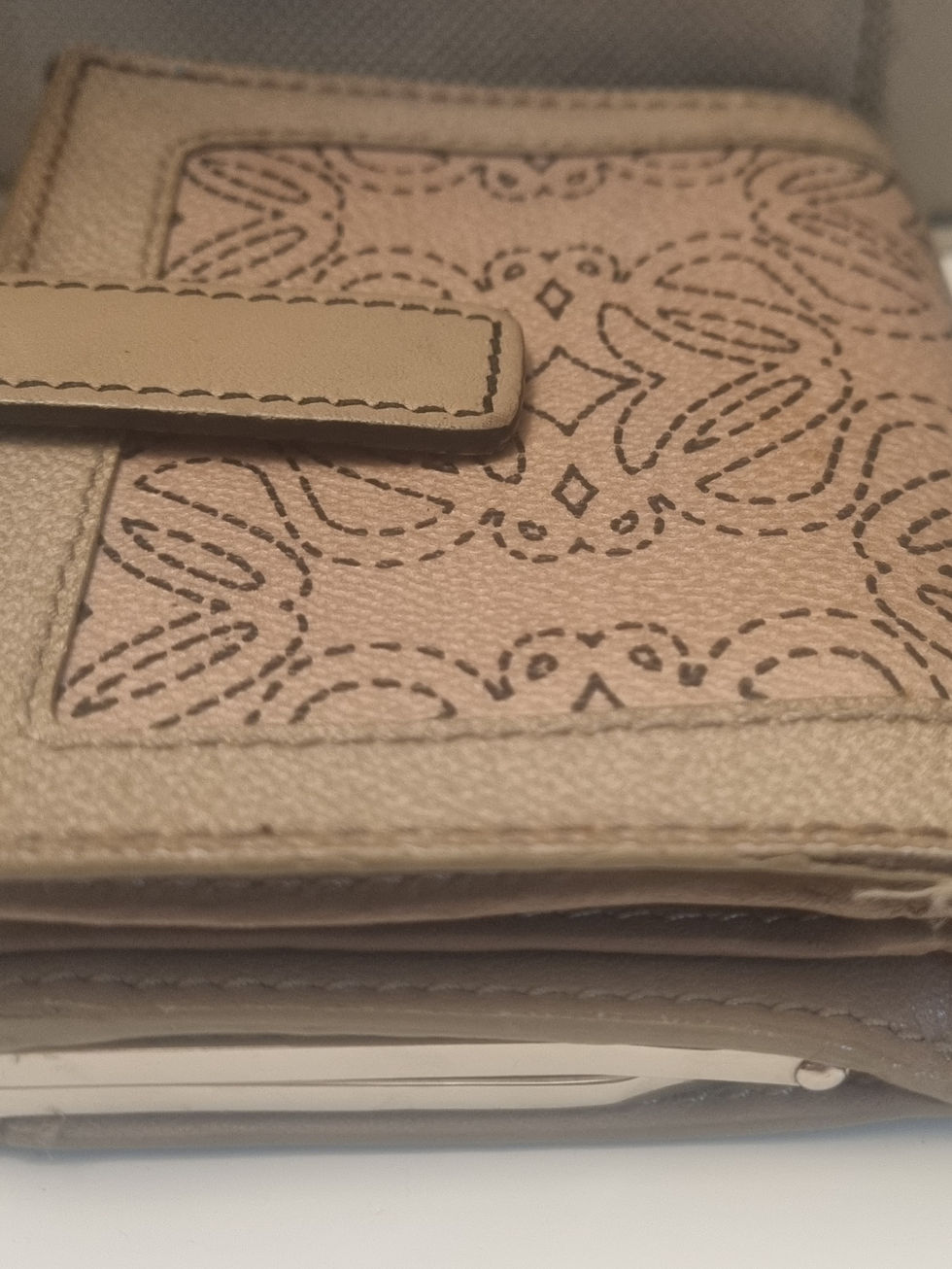 This item has been used and shows character through its signs of wear, particularly around the edges and inside the pockets.