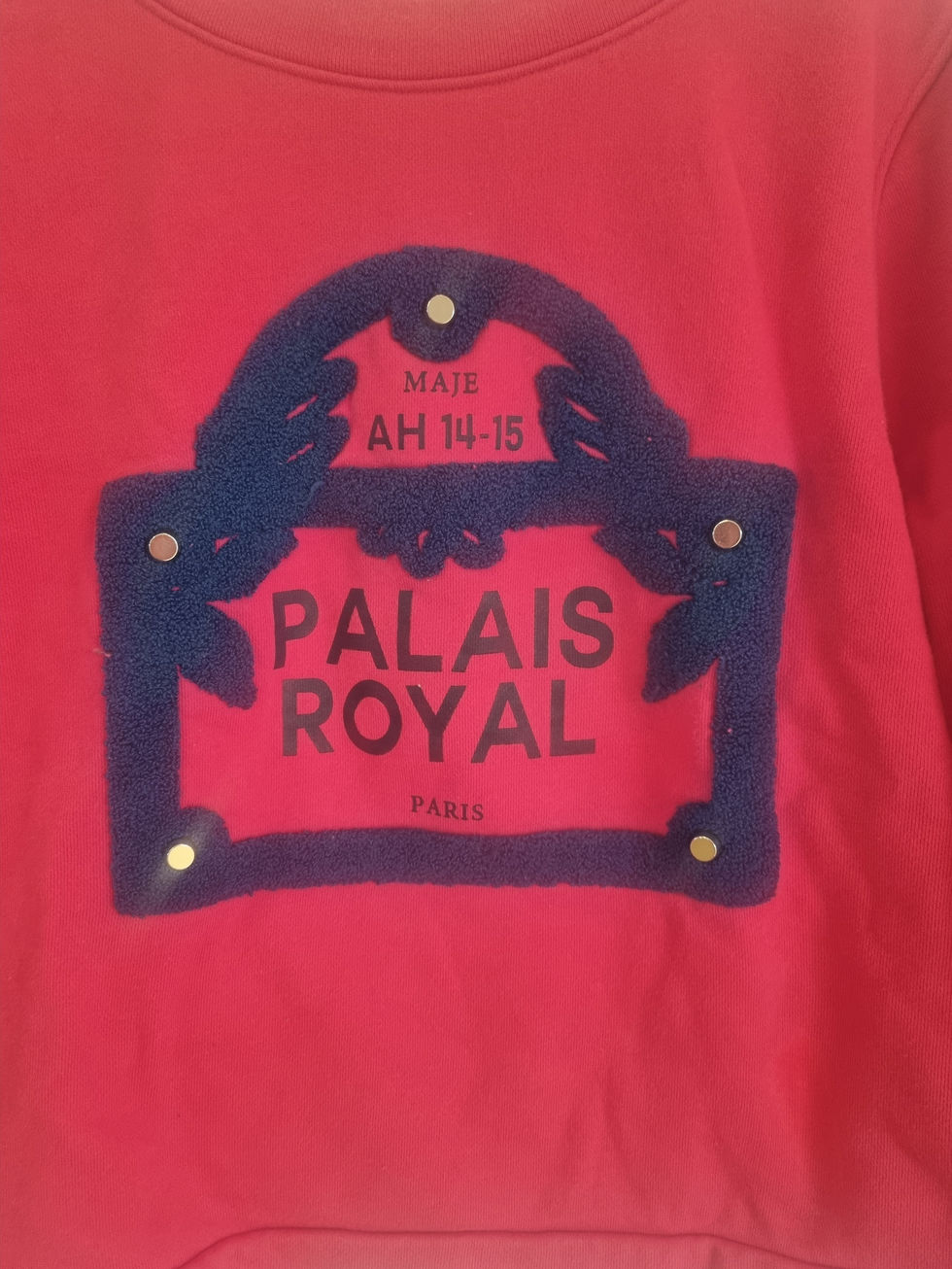 Add a touch of Parisian chic to your wardrobe with this authentic Maje Palais Royal sweatshirt. Featuring a bold red color and soft, cozy fabric, this statement piece is highlighted with a textured appliqué design that reads "Palais Royal Paris" and decorative details on the front.