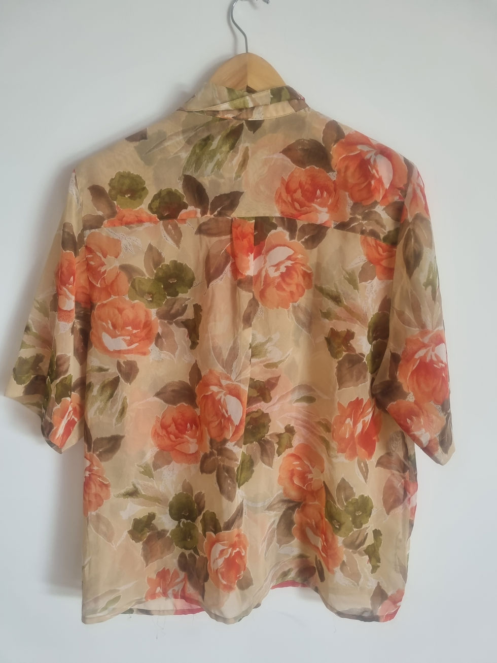 This beautiful oversized sheer shirt features a soft floral print in warm tones of pink/red, green, and beige.